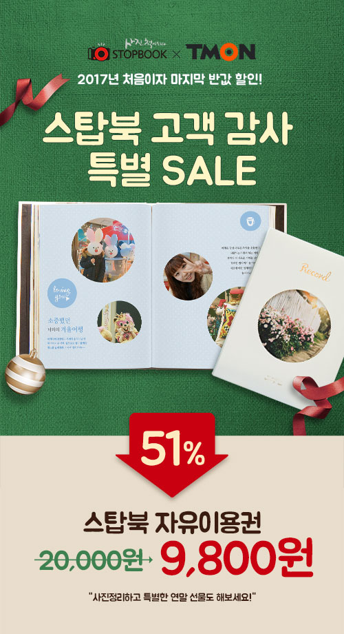 온라인 포토북 전문업체 스탑북은 연말을 맞아 22일부터 소셜커머스 티몬에서 2만원 자유이용권을 51% 할인된 가격인 9800원에 판매한다고 밝혔다.