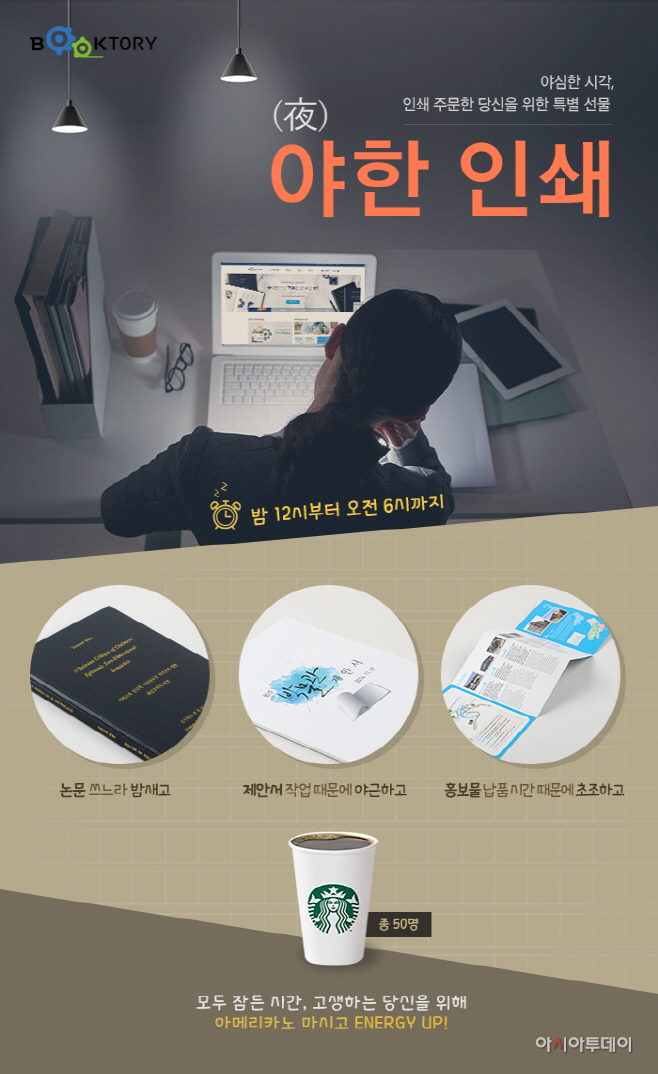 야(夜)한 인쇄로 불리는 이번 이벤트는 학위논문, 보고서 등의 인쇄를 위해 늦은 시간까지 북토리를 찾는 고객들에게 감사의 뜻을 전하고, 심야인쇄를 알리고자 기획됐다. 참여 방법은 심야인 자정부터 오전 6시 사이에 주문 결제 완료 후 이벤트 참여 댓글을 달면 자동으로 응모되며, 추첨을 통해 선발된 50명의 당첨자에게는 스타벅스 아메리카노 기프티콘을 증정한다.