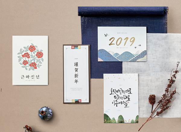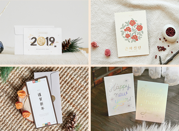 전통 느낌이 물씬 풍기는 연하장부터 퓨전 전통 연하장, 따뜻한 덕담이 쓰인 캘리그라피 연하장, 세련된 느낌의 영문 타이포 연하장 등 다양하다. 특히 대부분의 연하장에 다양한 금박 가공이 적용되어 연하장에 디테일과 품격을 더했다. 특히 올해의 동물인 돼지를 활용한 ‘십이간지’ ‘사랑과 감사’ ‘행복 전하기’ ‘복 한아름’이 눈길을 끈다.
