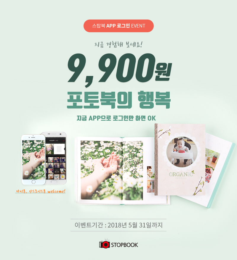 스탑북 앱은 로그인하는 누구에게나 앱 포토북 50%할인 쿠폰을 증정하는 이벤트(사진)를 진행하고 있다. 스탑북앱 포토북의 정상가격은 1만 9800원으로 타 업체의 유사옵션(하드커버, 46페이지)과 비교해 저렴하다. 앱 로그인 이벤트 쿠폰을 사용하면 소중한 추억이 담긴 포토북을 단 9900원으로 구매할 수 있다.