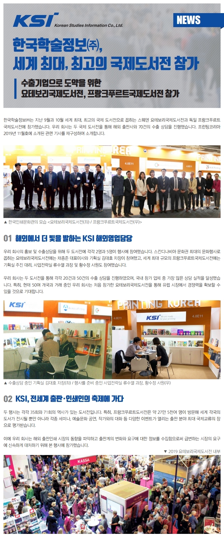 한국학술정보㈜는 지난 9월과 10월 세계 최대, 최고의 국제 도서전으로 꼽히는 스웨덴 요테보리국제도서전과 독일 프랑크푸르트 국제도서전에 참가했습니다. 우리 회사는 두 국제 도서전을 통해 해외 출판사와 70건의 수출 상담을 진행했습니다. 프린팅코리아 2019년 11월호에 소개된 관련 기사를 재구성하여 소개합니다.